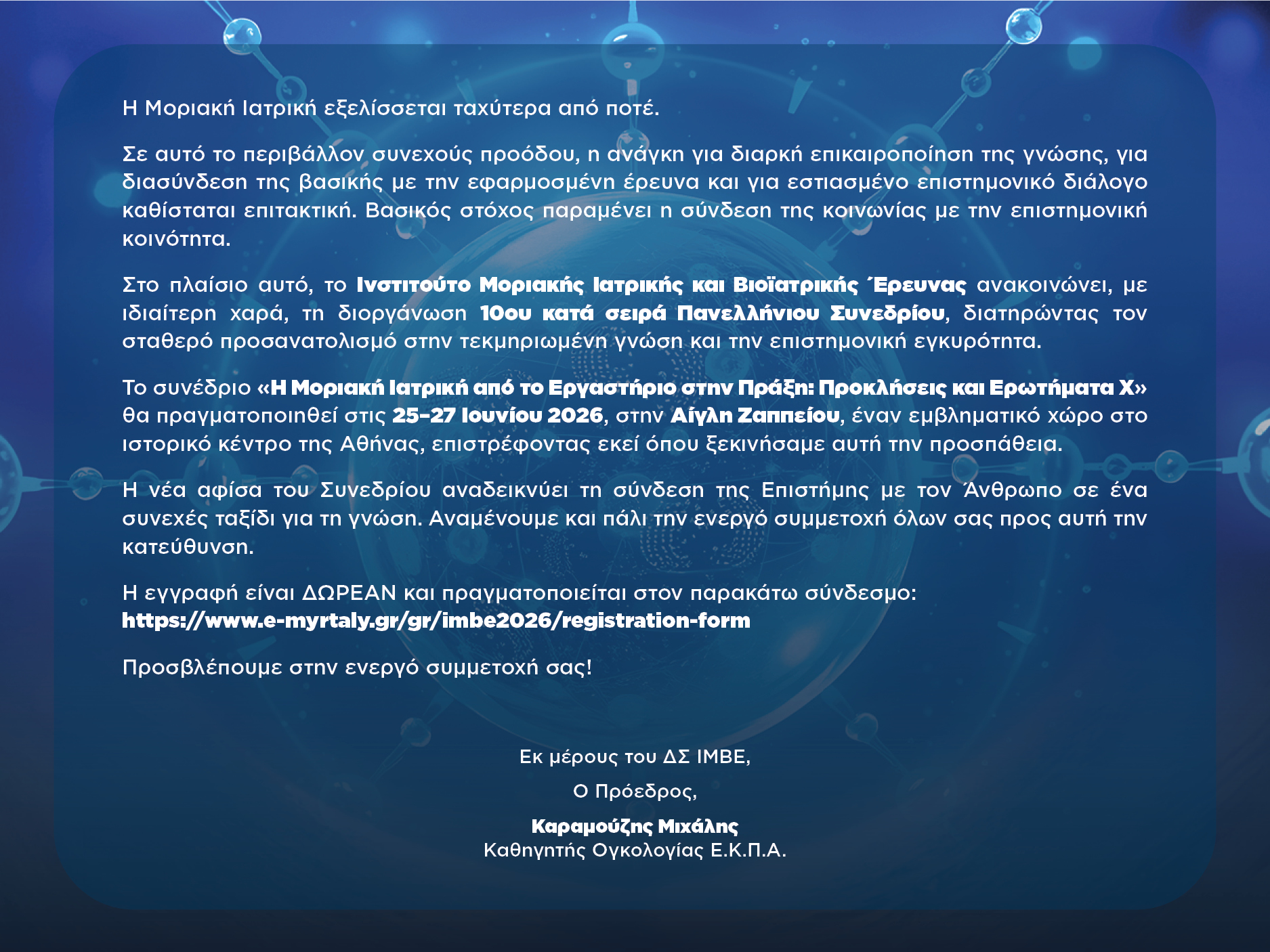 10ο Πανελλήνιο Συνέδριο «Η Μοριακή Ιατρική από το Εργαστήριο στην Πράξη: Προκλήσεις και Ερωτήματα Χ»