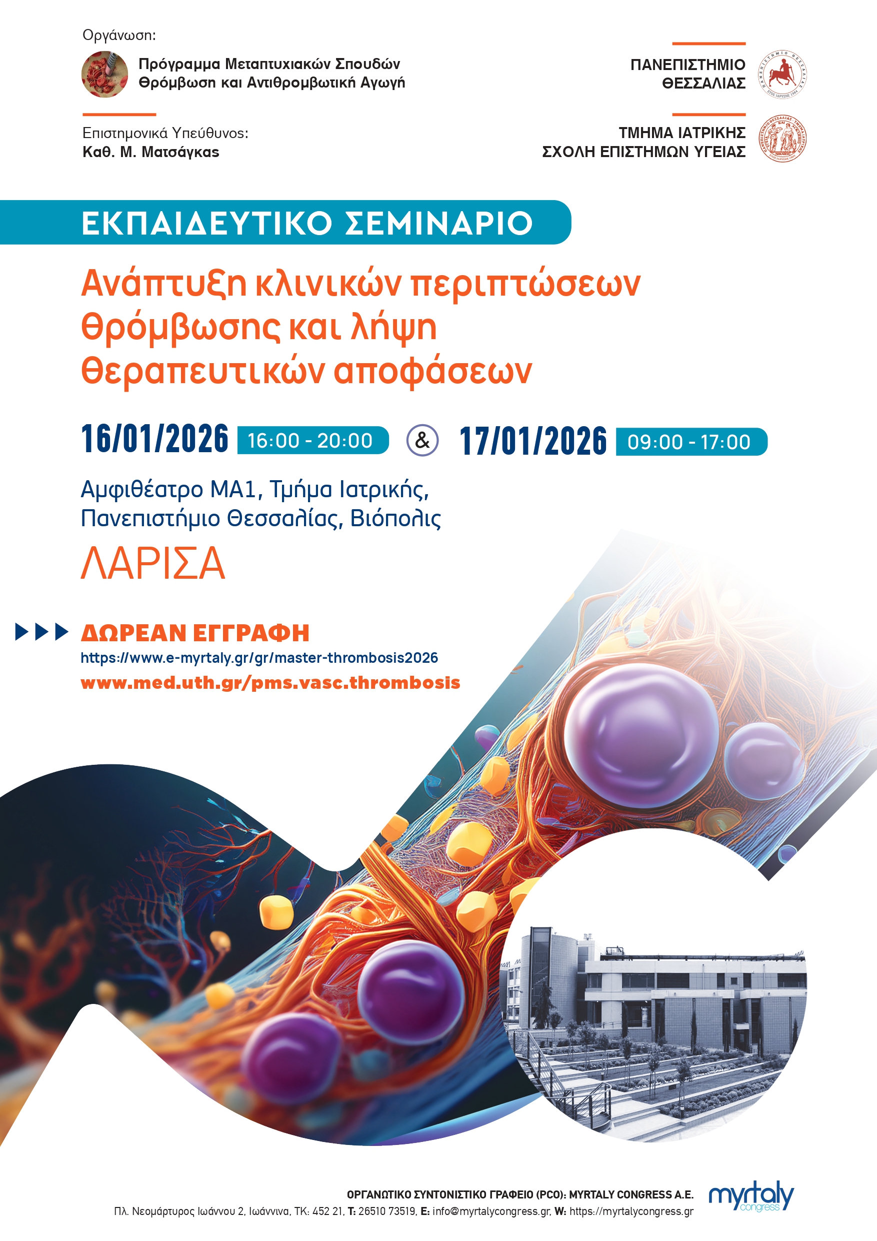 To Εκπαιδευτικό Σεμινάριο θα πραγματοποιηθεί την Παρασκευή, 16 και το Σάββατο 17 Ιανουαρίου 2026, στο Αμφιθέατρο ΜΑ1 (Τμήμα Ιατρικής, Πανεπιστήμιο Θεσσαλίας, Βιόπολις) στη Λάρισα και διοργανώνεται από το Πρόγραμμα Μεταπτυχιακών Σπουδών «Θρόμβωση και Αντιθρομβωτική Αγωγή» του Τμήματος Ιατρικής της Σχολής Επιστημών Υγείας του Πανεπιστημίου Θεσσαλίας.