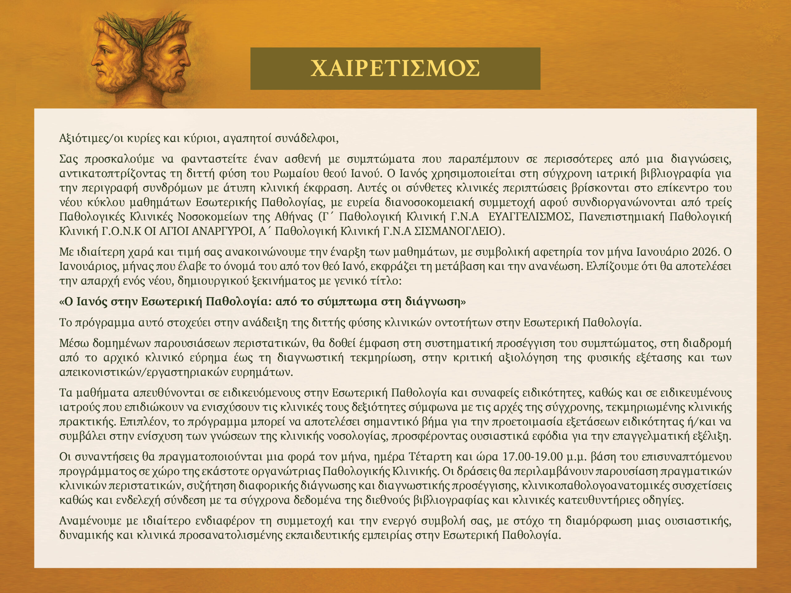 Κύκλος Μαθημάτων Εσωτερικής Παθολογίας: «Ο Ιανός στην Εσωτερική Παθολογία: από το σύμπτωμα στη διάγνωση»